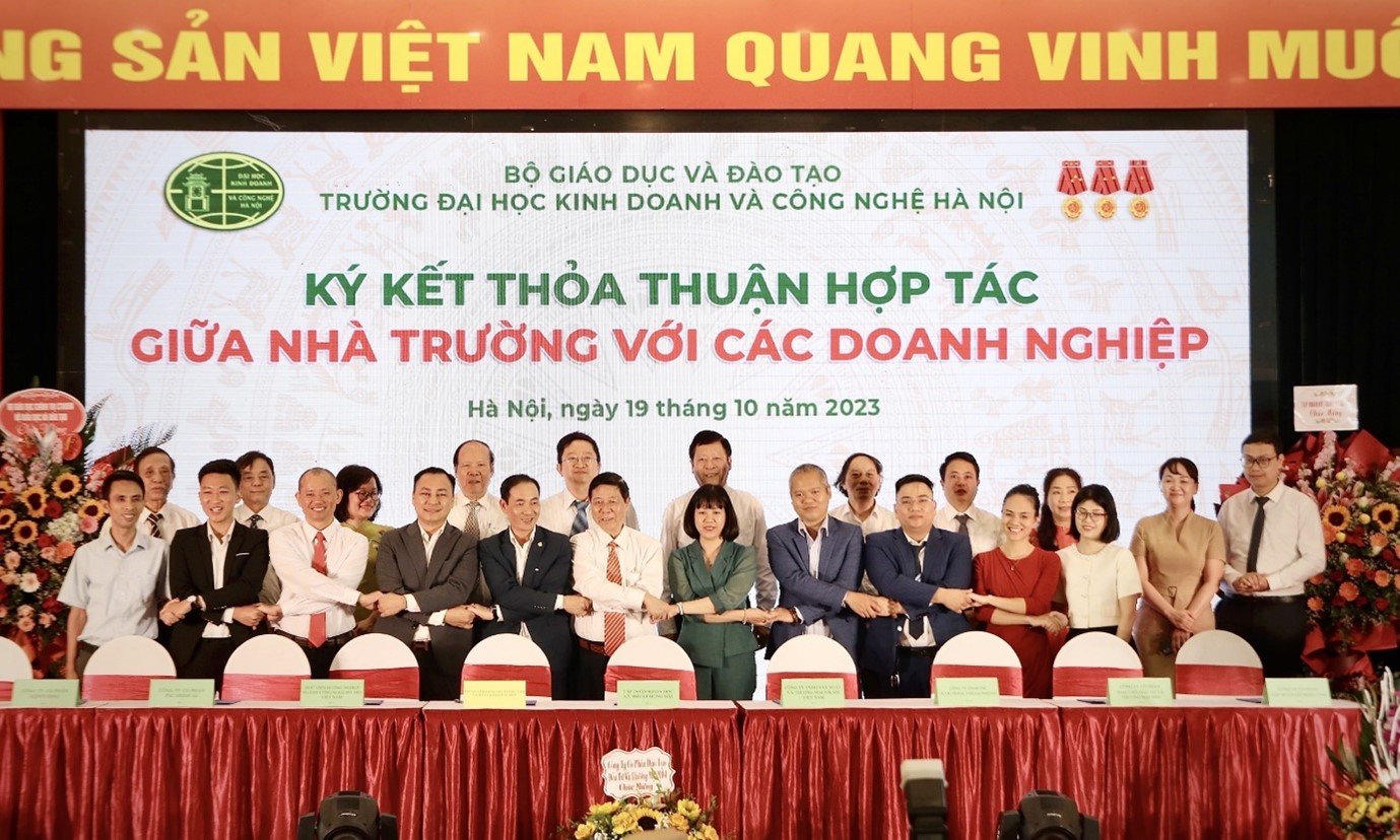 Lễ ký kết là sự hợp tác thiết thực giữa Nhà trường và các doanh nghiệp, tạo ra nhiều cơ hội việc làm cho sinh viên HUBT sau khi ra trường. (TGĐ Nguyễn Việt Dũng đứng hàng đầu thứ 5 từ phải qua)