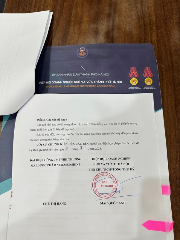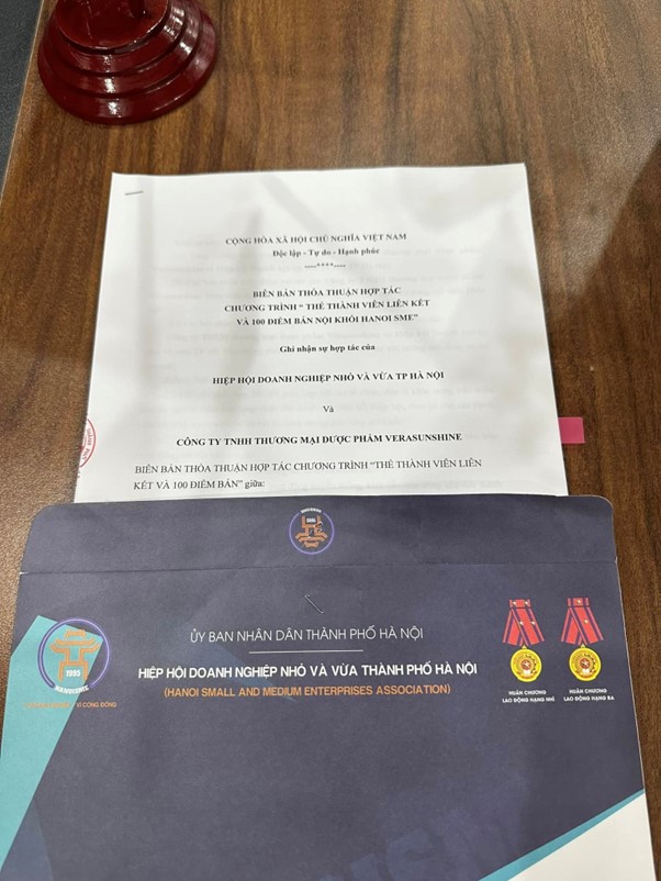 Tại Hà Nội ngày 21/09/2023 Đại diện Công ty TNHH TM Dược Phẩm VeraSunshine có Bà Chế Thị Hằng quyền giám đốc điều hành, Đại diện Hiệp Hội Doanh Nghiệp Nhỏ và Vừa (trực thuộc UBND thành phố Hà Nội) có Ông Mạc Quốc Anh Phó chủ tịch, Tổng thư ký hiệp hội đã ký kết hợp tác với hơn 100 điểm bán hàng.