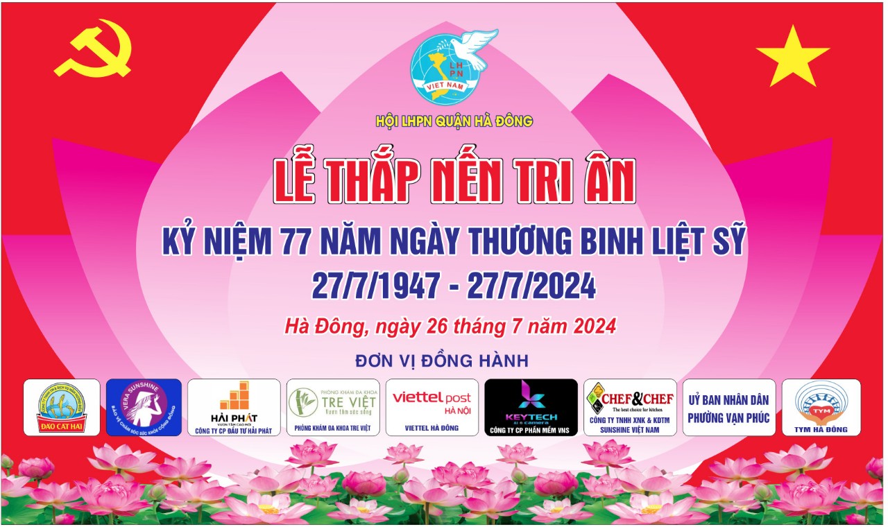 Tối ngày 26 tháng 7 năm 2024, trong không khí trang nghiêm, Dược phẩm VeraSunshine kết hợp cùng Hội Liên Hiệp Phụ Nữ Quận Hà Đông tổ chức lễ thắp nến tri ân nhằm ghi nhớ 77 năm ngày Thương binh Liệt sĩ (27/7) tại Nghĩa trang Liệt sỹ quận Hà Đông.