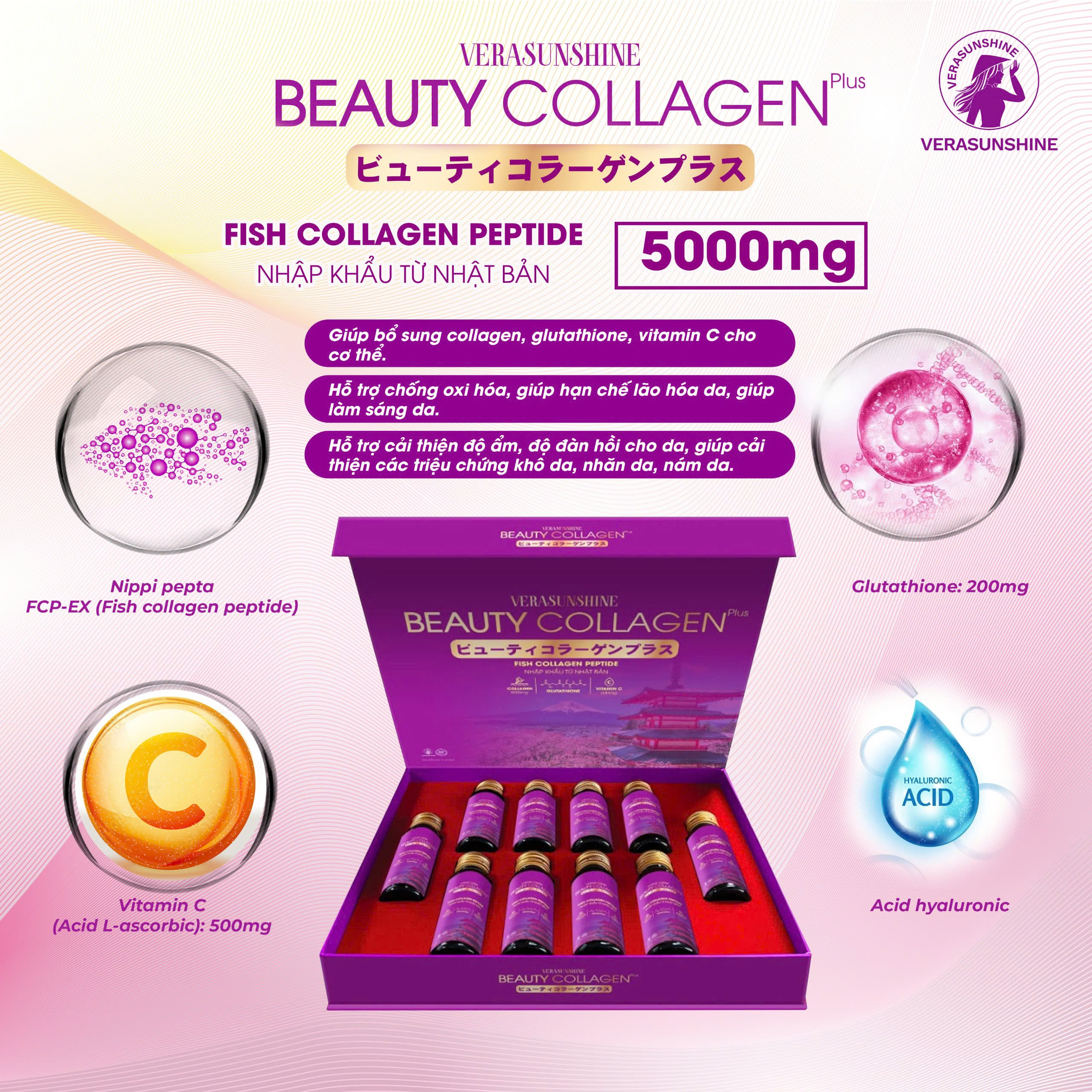 - Giúp bổ sung Collagen, glutathione, vitamin C cho cơ thể. Hỗ trợ chống oxi hóa, giúp hạn chế lão hóa da, làm sáng da.